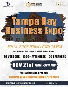 Get ready, Tampa Bay! The biggest business event of the year is back and bigger than ever. Don’t miss the 7th Annual Tampa Bay Business Expo, happening Friday, November 21 from 9:00 AM to 3:00 PM at the elegant Hotel Flor Downtown Tampa — a full day packed with opportunity, innovation, and connection.