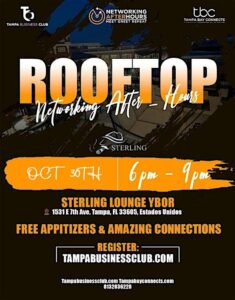Get ready to take your networking to new heights! Join Tampa’s top professionals for an unforgettable evening at the Rooftop Networking After-Hours at Sterling Lounge, kicking off on October 30 from 6:00 PM to 9:00 PM — and running through December 30!