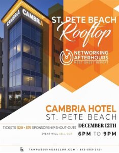 Looking to network with a view? Join us Wednesday, December 10 from 6:00 PM to 9:00 PM for an unforgettable evening of sunset networking, delicious bites, and meaningful connections at the stunning Cambria Hotel St. Petersburg–Madeira Beach Marina.