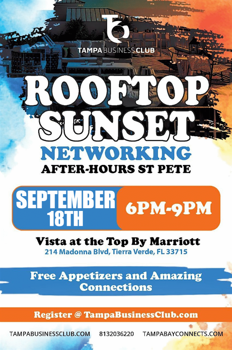 Mark your calendars and prepare to elevate your networking game—literally! Join Tampa Bay’s most driven professionals for Rooftop Networking After-Hours @ Vista on the Top by Marriott on Thursday, August 14th from 6:00 to 9:00 PM EDT at the stunning Vista at the Top (214 Madonna Boulevard, Tierra Verde, FL 33715). Set against sweeping waterfront views, this high-energy rooftop gathering […]